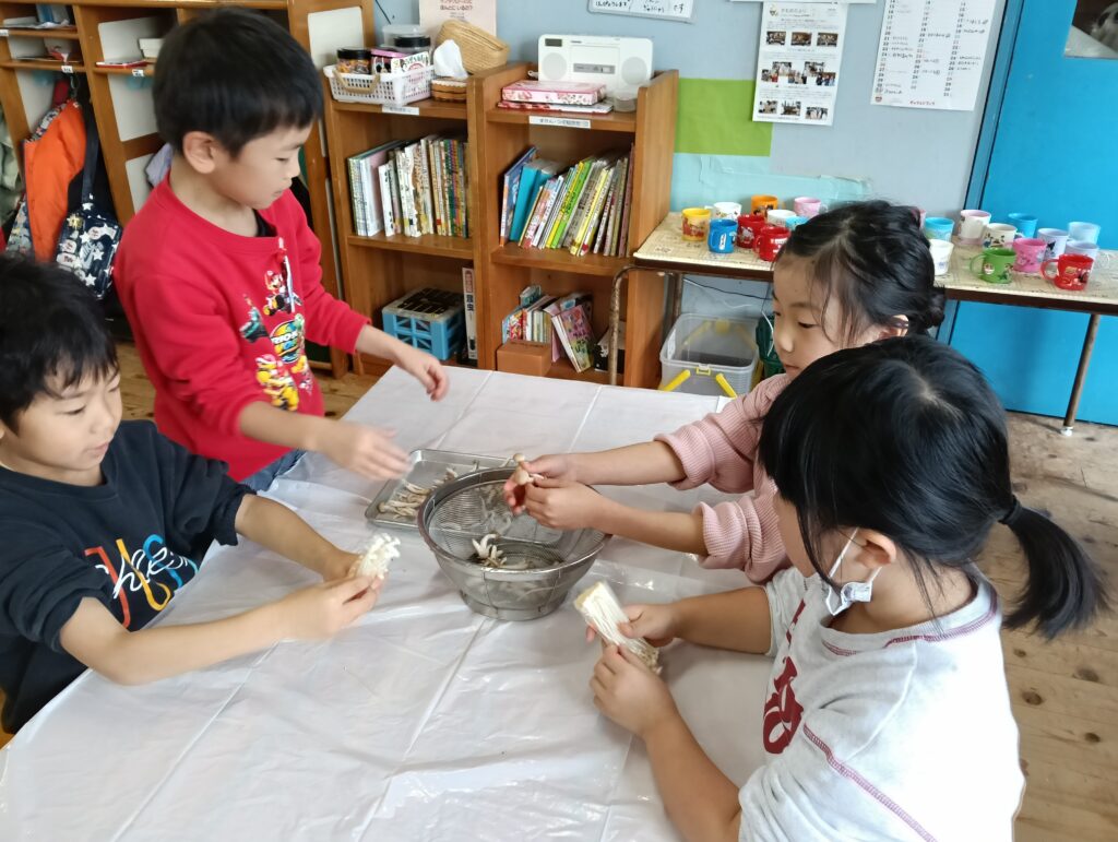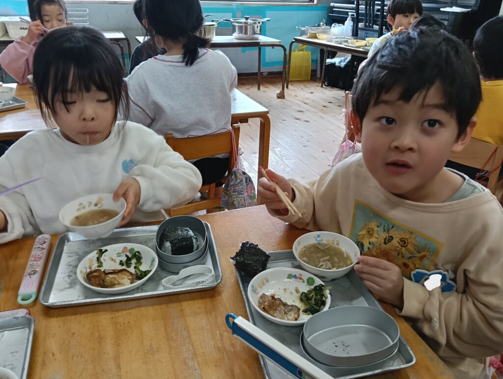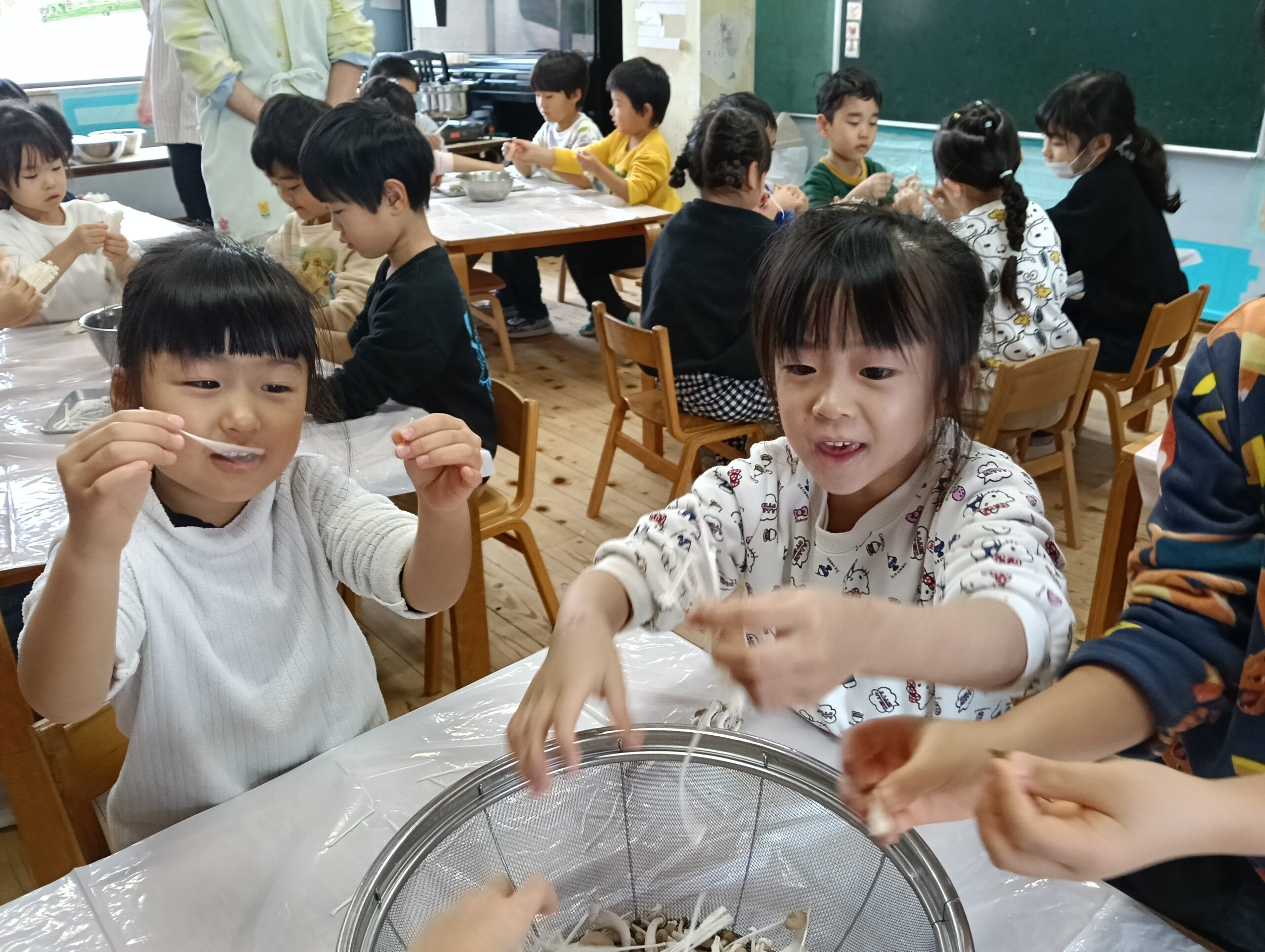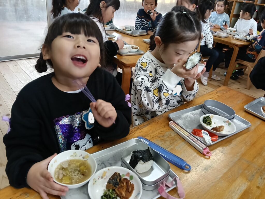 おいしかったね、さつま汁(5歳児かもめ組) 今日は、延期していたさつま汁作りを行いました。 秋に収穫したさつま芋を使って、クッキングスタート! まずは、きのこをさくお手伝いです。 次に、さつま芋を切る様子、鍋に材料を入れて調理する様子を見ました。出汁を味見した時は、「うどんのにおいがする!」と驚いていましたよ。 そして、今日はお弁当のご飯を自分でおにぎりにして「いただきま~す!」 「おいしい!」「甘~い」と大好評。大きな鍋3個に作ったさつま汁は、みんながおかわりをして空っぽになりましたよ。さつま汁、おいしかったね! By hoikuen | 2025年12月17日 | 保育園のいま | No Comments | ← もうすぐクリスマス!! コメントを残す コメントをキャンセルメールアドレスが公開されることはありません。 ※ が付いている欄は必須項目ですコメント ※ 名前 ※ メール ※ サイト 次回のコメントで使用するためブラウザーに自分の名前、メールアドレス、サイトを保存する。 Δ このサイトはスパムを低減するために Akismet を使っています。コメントデータの処理方法の詳細はこちらをご覧ください。