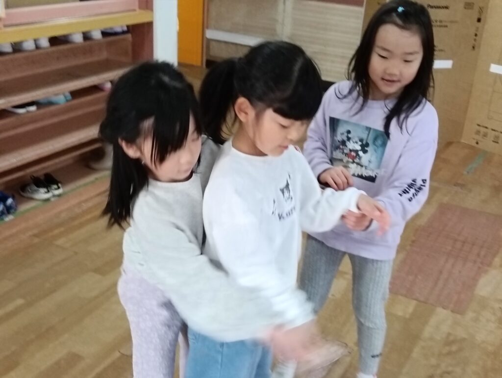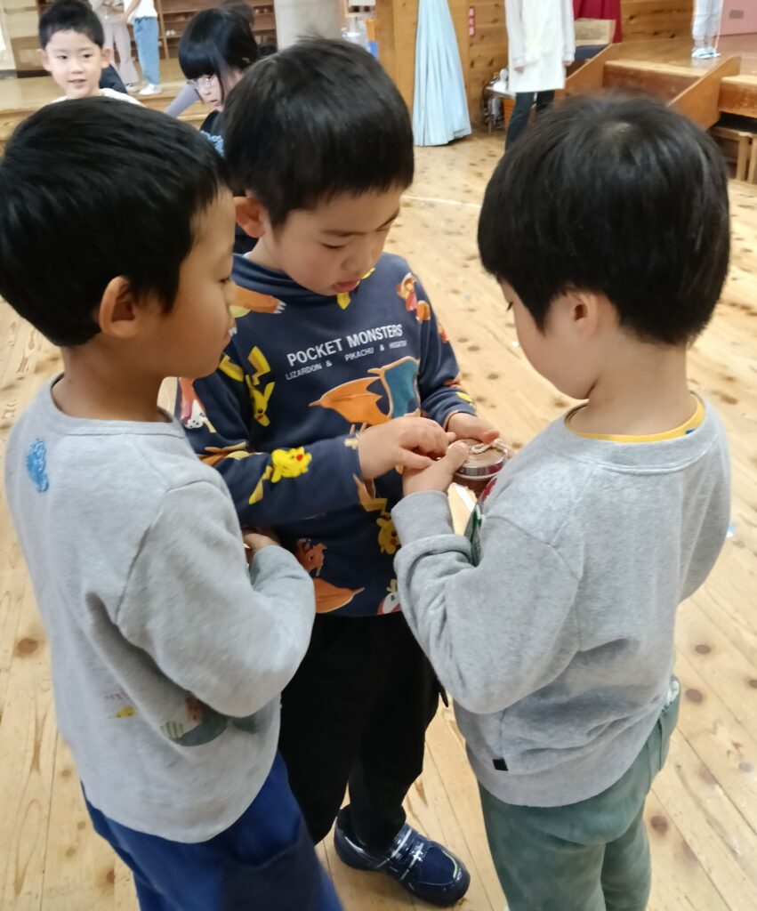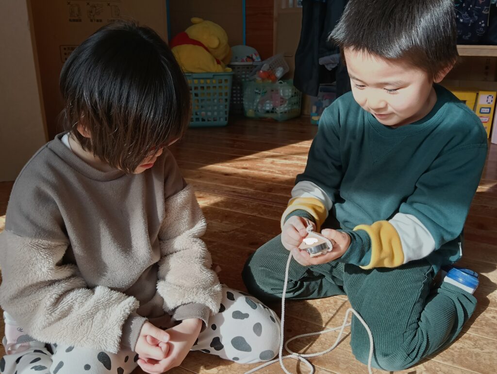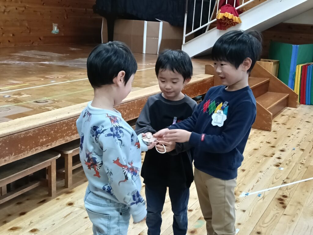 鎧郷保育園では、古くから親しまれている伝承遊びとしてこま回しを取り入れています。初めてこま回しに挑戦する年中ひばり組に、年長かもめ組の子ども達が、ひもの巻き方やこまの回し方を伝承する「こま伝授式」を行いました。