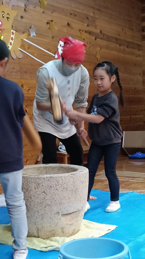 子どもたちは興味津々です。湯気の上がったもち米が臼の中に入れられると歓声が上がりました!