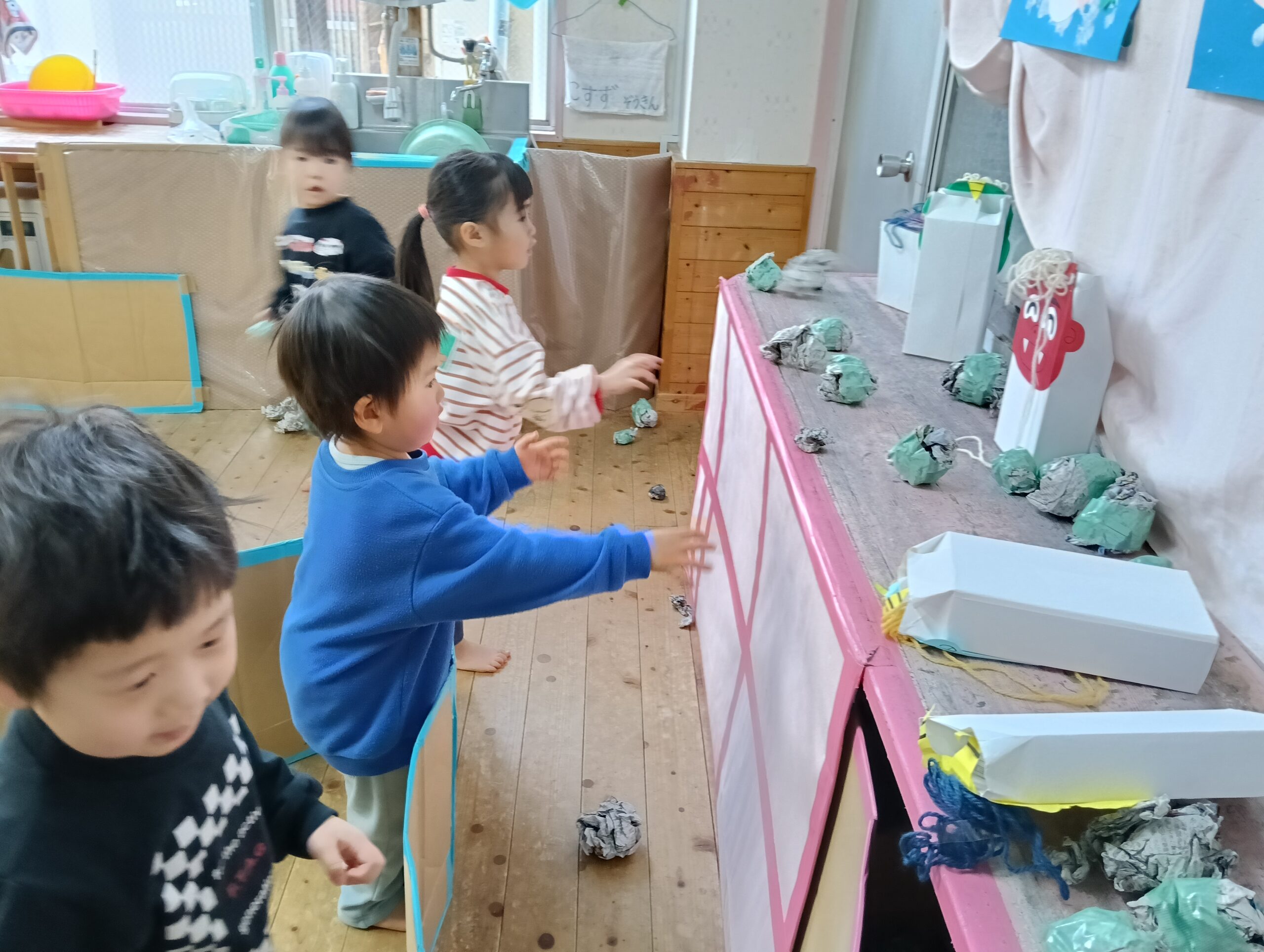 幼児クラスの豆まき大会は前日から始まります。みんなで鬼に投げる新聞紙の豆にパワーを入れました。