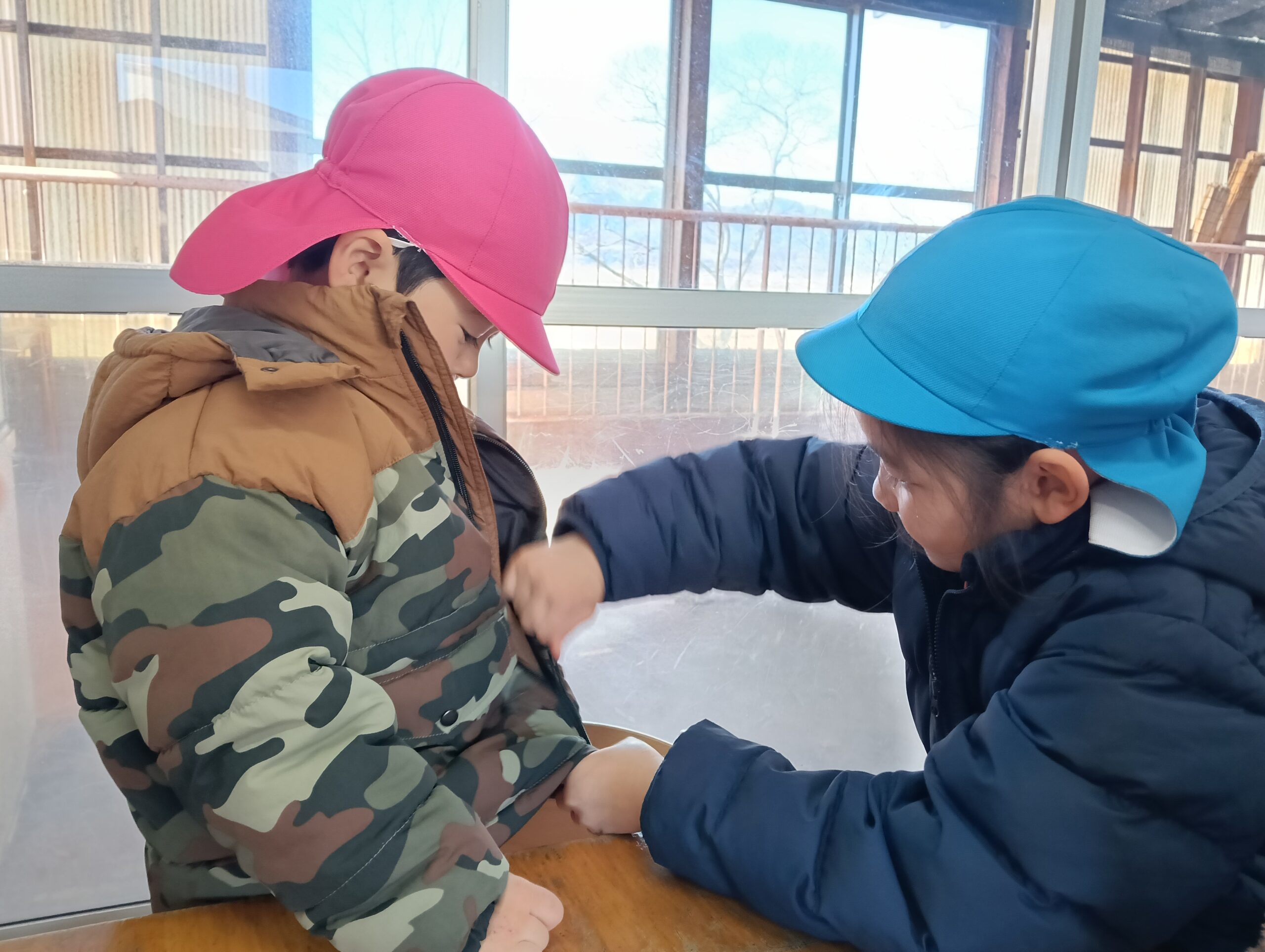 散歩前にお兄さんお姉さんが身支度の手伝いをしてくれていました。