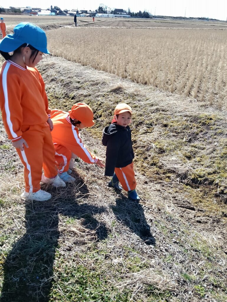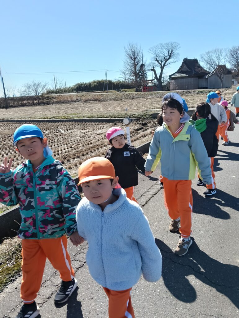 散歩は西汰上のお宮まで行って来ましたよ。お宮では、鬼ごっこやかくれんぼをして遊んでいた子どもたちです。遊んでいる途中につくしを見つけ、春を感じました🌸