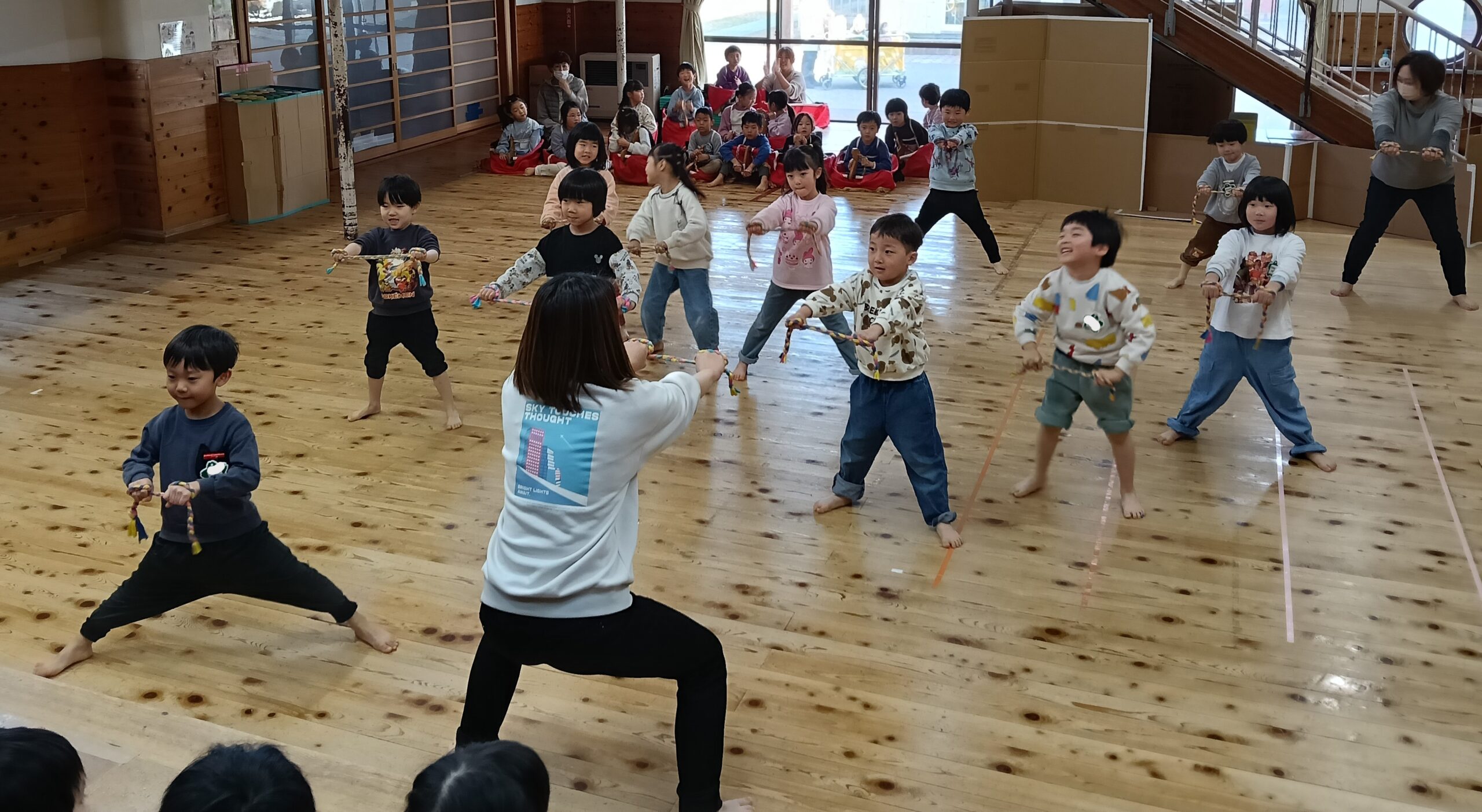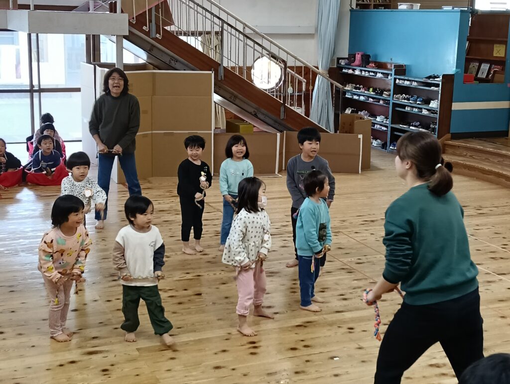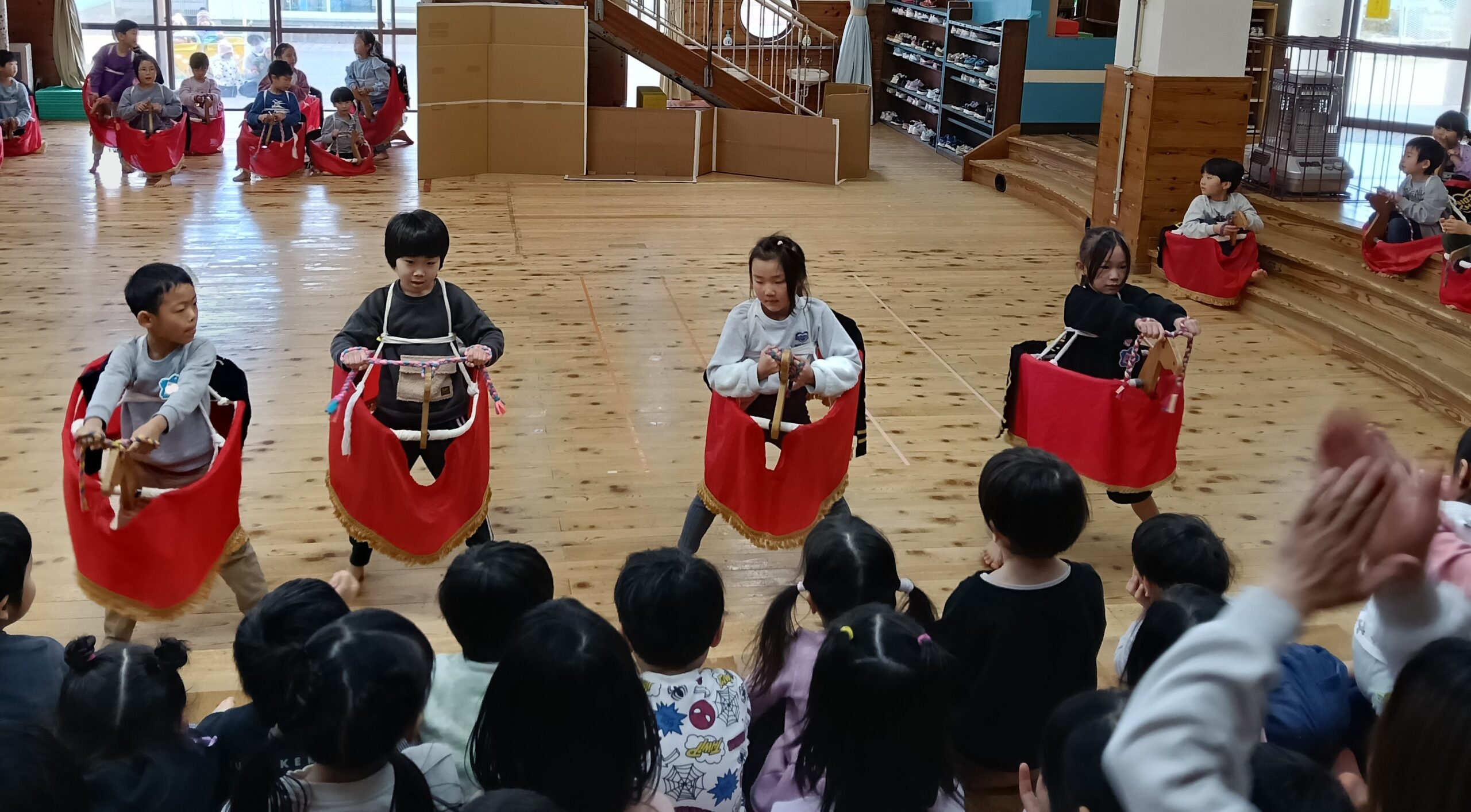 今日は荒馬伝授式でした。運動場に、かもめさん、ひばりさん、こばとさんが集まって荒馬を跳ねました。馬を付けてダイナミックに跳ねるかもめさんを見て、目を輝かせていたひばりさん、こばとさんの子どもたちでした。