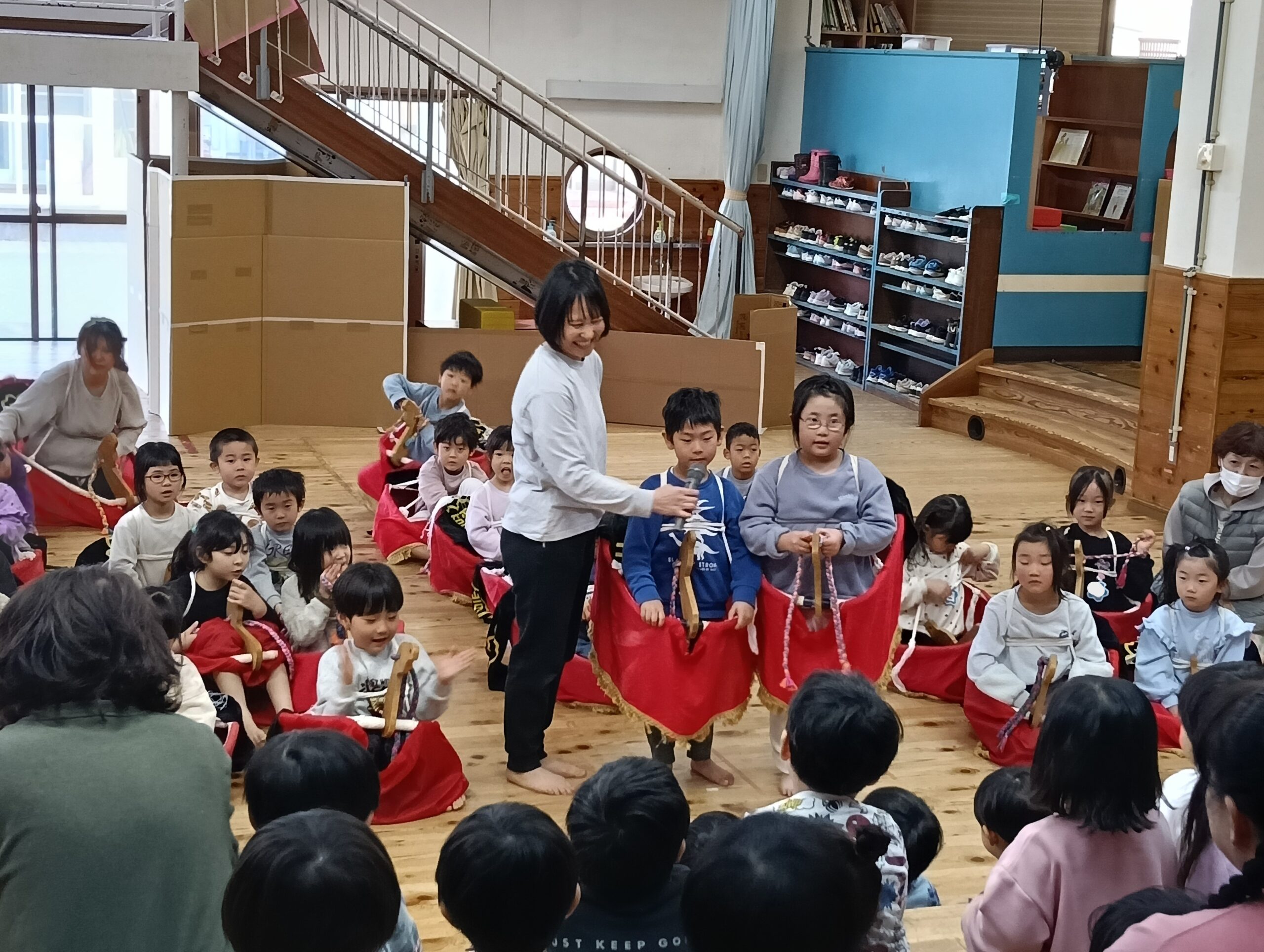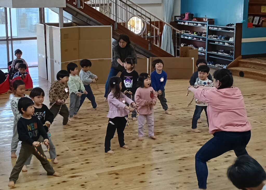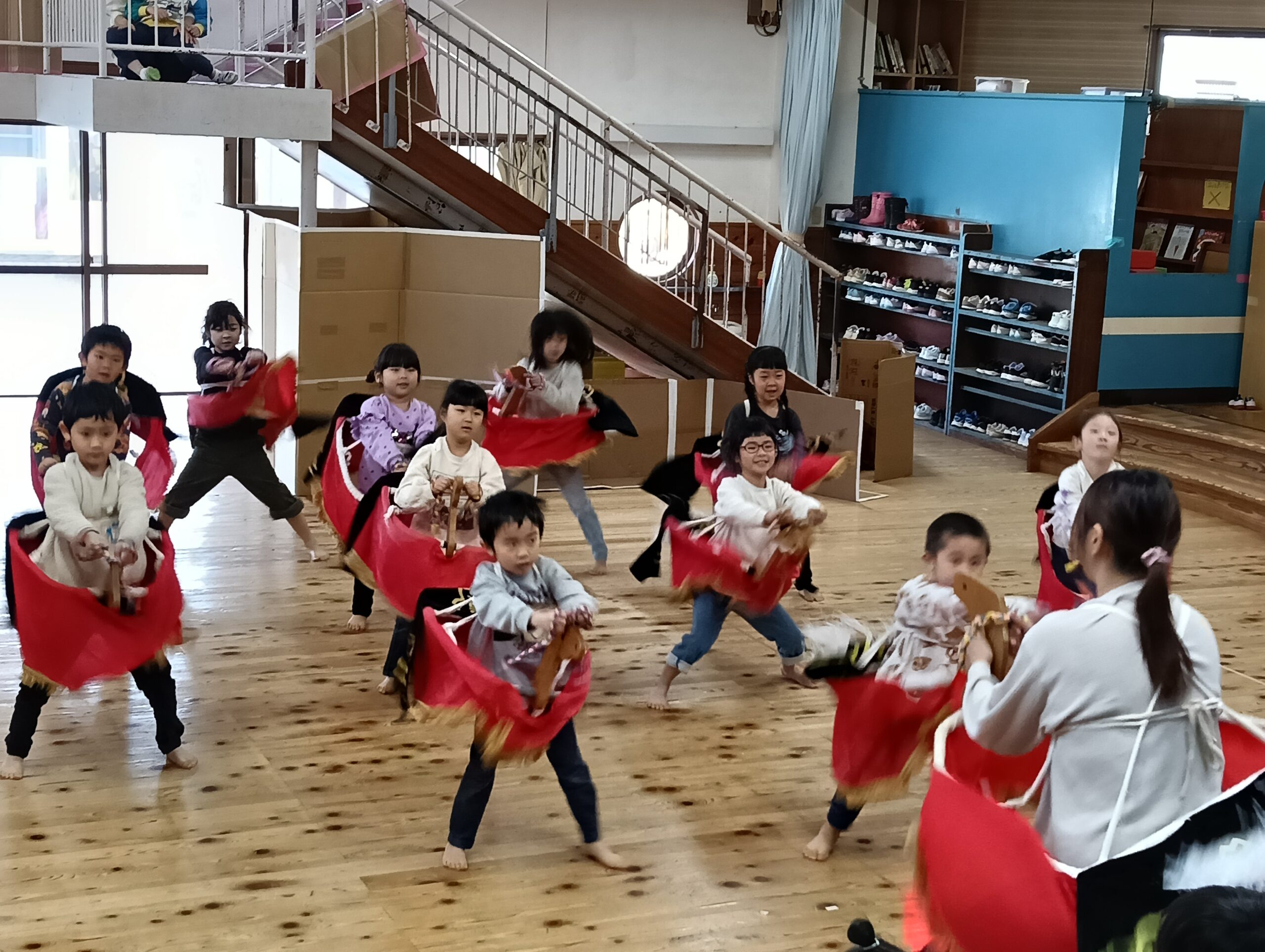 今日は荒馬伝授式でした。運動場に、かもめさん、ひばりさん、こばとさんが集まって荒馬を跳ねました。馬を付けてダイナミックに跳ねるかもめさんを見て、目を輝かせていたひばりさん、こばとさんの子どもたちでした。