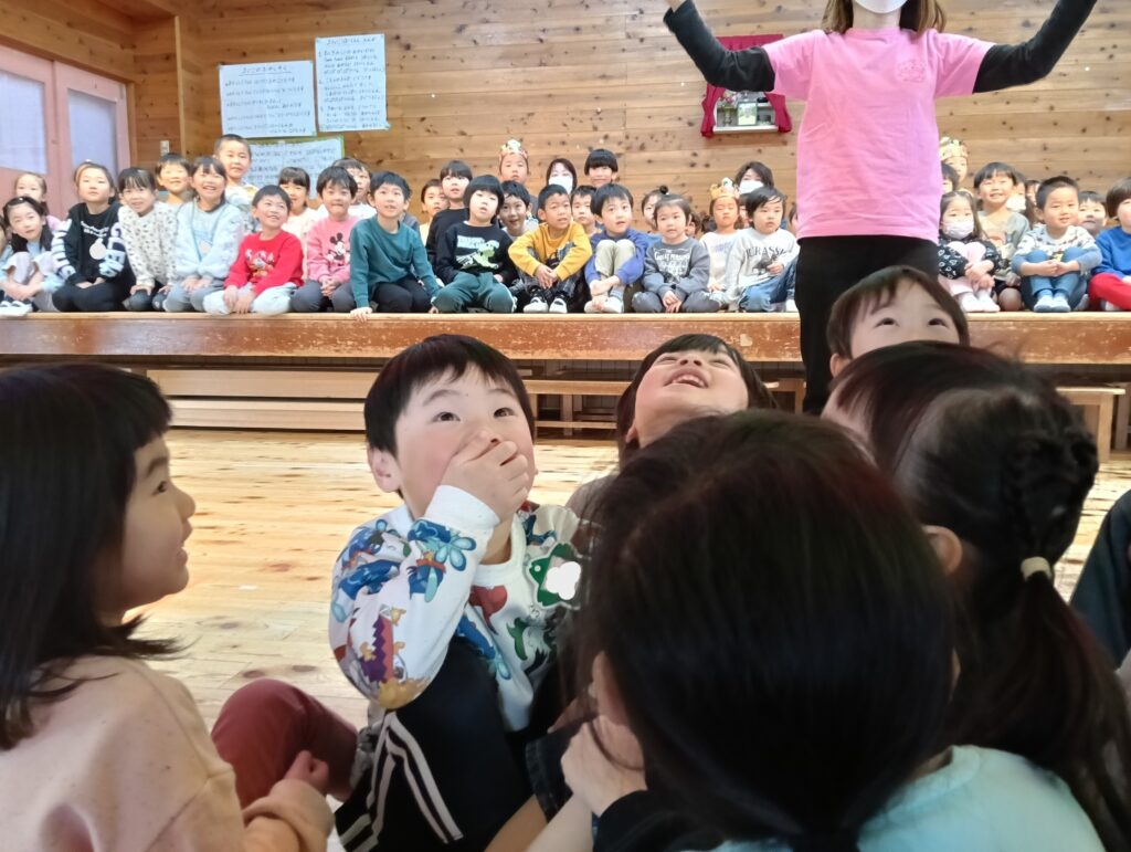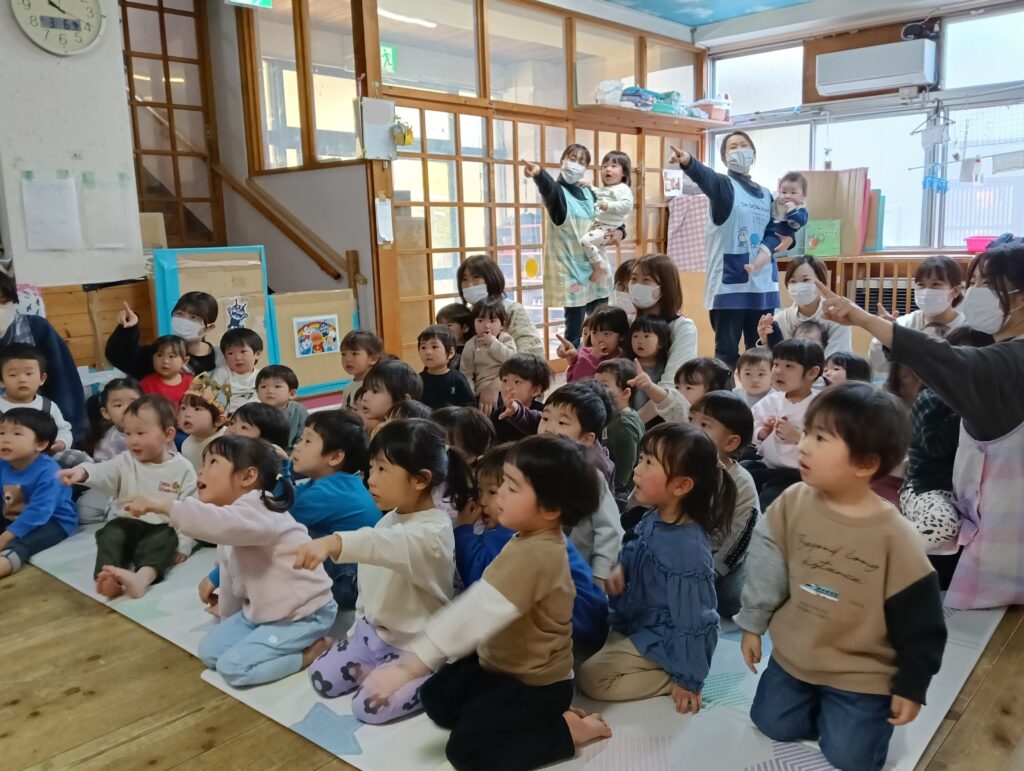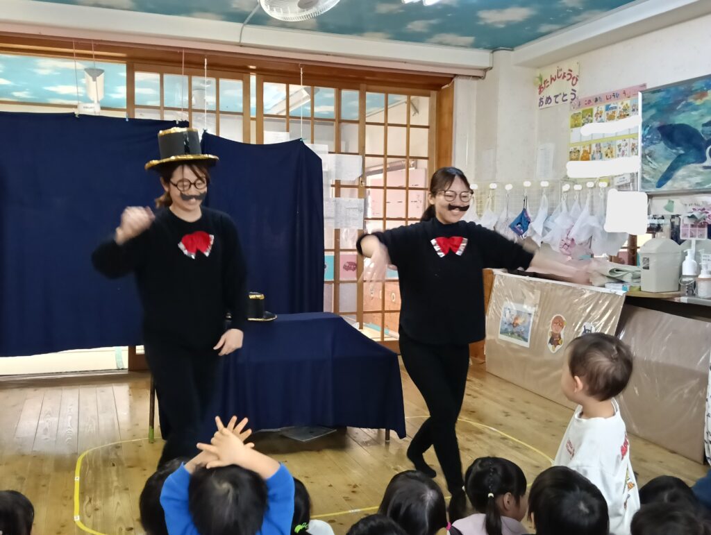 今日は3月生まれのお誕生会でした。各クラスで誕生児をお祝いした後、乳児組と幼児組で楽しい催し物を見ました。それでは、様子をご紹介します。