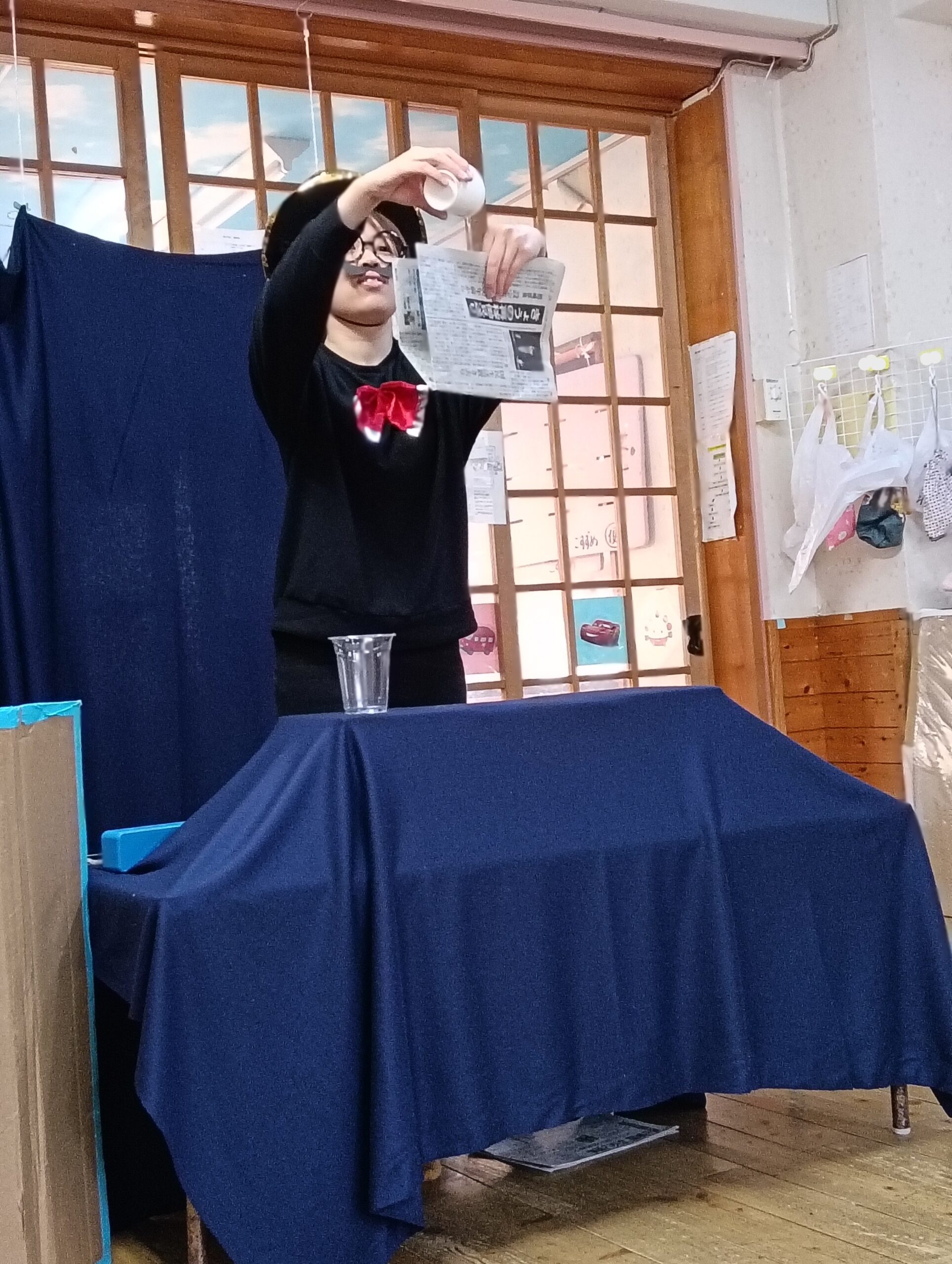 紙コップに入れたティッシュが消えたり、新聞紙に注いだお水が消えたりして、みんなびっくり!